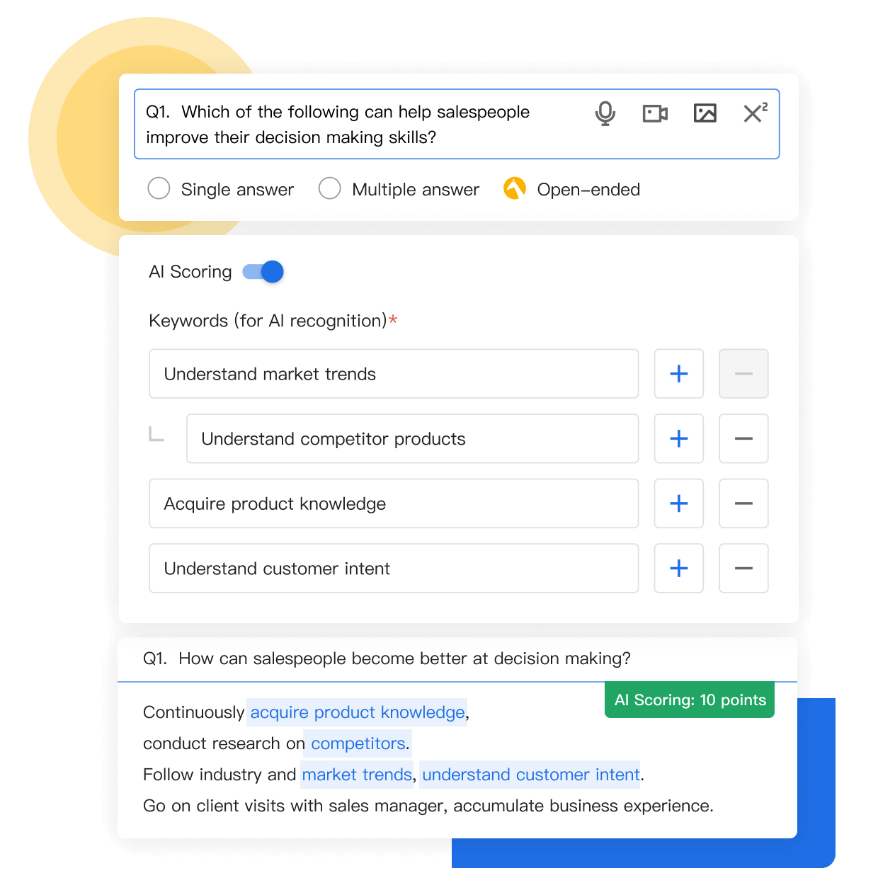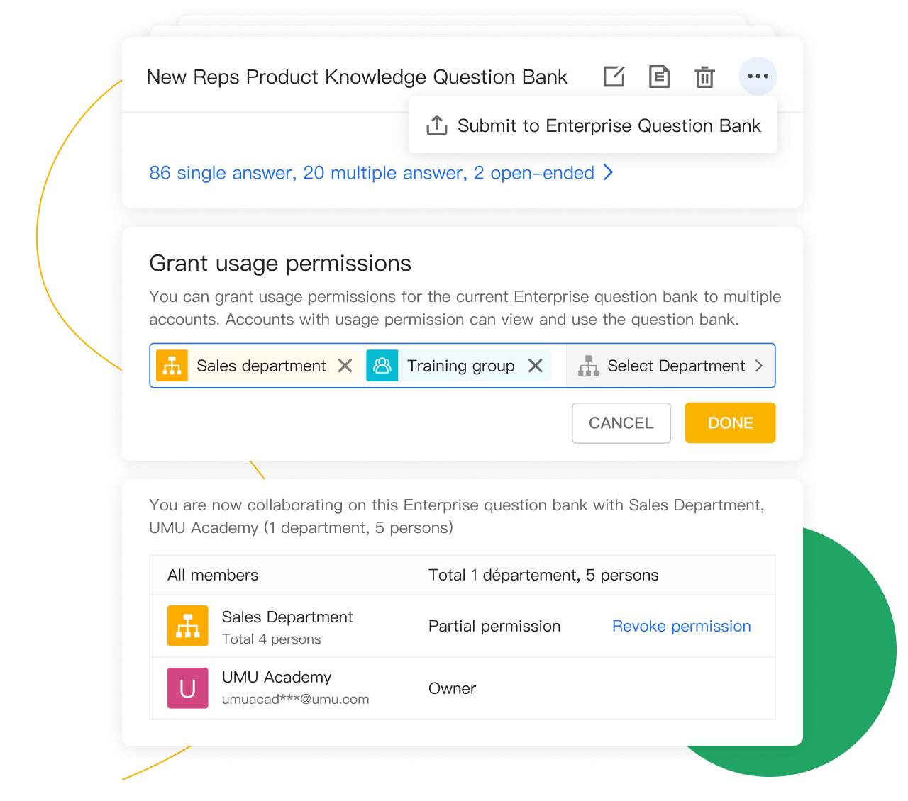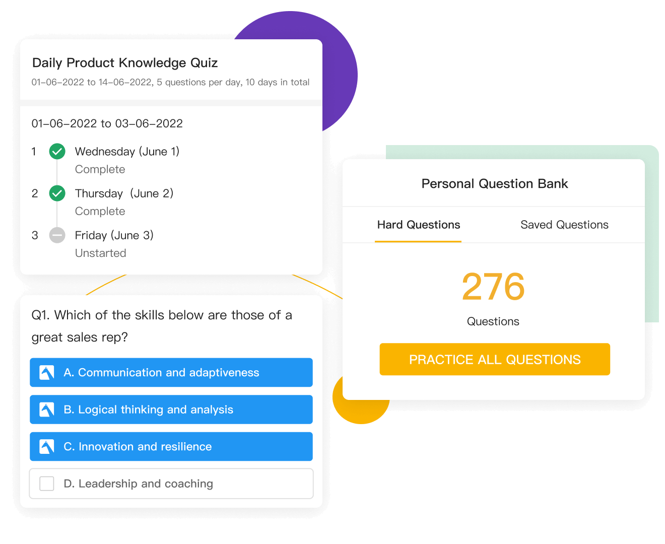 Centralize the management of knowledge points with UMU Question Banks and create randomized quizzes in just a few clicks. Conduct gamified Daily Quiz activities and internal competitions. Help employees learn through self-assessment and spaced repetition.