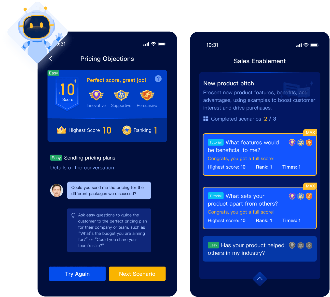 - Enable reps to practice pitches, demos, and buyer interactions through AI
